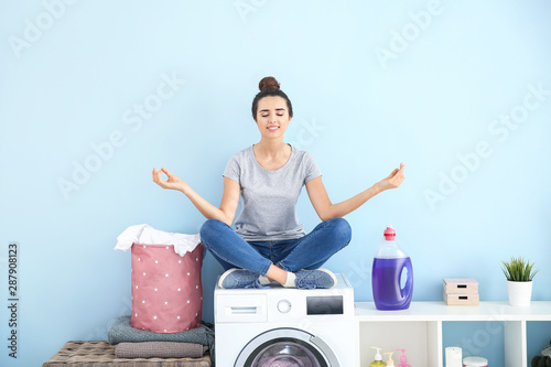 Sitting On Washing Machine, A Woman Loads Dirty Laundry Into A Washing Machine While Sitting On The Floor In An Apartment Laundry Day Housework Canstock - You will run a completecycle without clothes, using hot water.